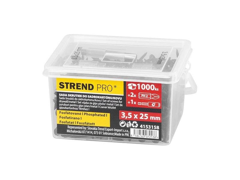 Praktická sada obsahuje 1000 kusů vrutů o velikosti 3,5 x 25 mm, magnetický držák a 2 kusy PH2 bitů.