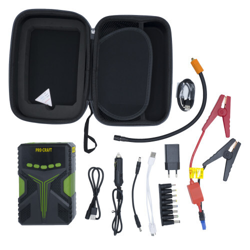 Startovací zdroj s funkcí kompresoru - pracovní tlak 3,5 bar, power banky, LED svítilny a LED výstražné svítilny. Kompaktní záložní zdroj elektrické energie pro případ nouzového statování vozidla, dobíjecí zdroj mobilního telefonu, tabletu nebo noteboku - nouzová výstražná svítilna. Součástí balení je sada startovacích kabelů, redukcí a adapterů pro připojení dalších zařízení. JSAP-12NE zvládne při plném nabití nastartovat vozidlo s el. rozvodem 12V a se zdvihovým objemem motoru do 8000cm3.