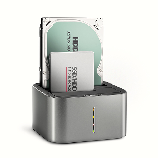 SuperSpeed USB-C 5Gbps dokovací / klonovací stanice AXAGON ADSA-DC DUAL CLONE připojí k počítači snadno a rychle až dva 2.5" nebo 3.5" disky současně. Připojení k počítači umožňuje moderní oboustranný USB-C konektor na doku spolu s dodávaným kabelem USB-C USB-A o délce 80 cm.Tento šikovný pomocník vám tak umožní nejjednodušší připojení 2.5"/3.5" SATA disků k počítači nebo notebooku. Jeden nebo i dva disky současně jen stačí zasunout do základny, nejsou potřeba žádné nástroje ani doplňky. Výměna disků je tak velmi rychlá a jednoduchá.Dokovací stanici také využijete pro snadné klonování obsahu připojených disků bez potřeby připojení k PC. Do prvního slotu stanice HDD A (source) zasunete zdrojový disk a do druhého slotu HDD B (target) zasunete cílový disk. Pak jen zmáčknete klonovací tlačítko a sledujete průběh klonování na stupnici čtyř LED diod. Po zkopírování všech dat je na cílovém disku přesná kopie původního disku. Dock tak lze využít jako autonomní zařízení pro pohodlné duplikování a vytváření obrazů disků. Jedná se o nejjednodušší způsob, jak přenést obsah starého HDD disku na nový SSD disk, a to včetně funkčního operačního systému (Windows, macOS, Linux …).Rozhraní SATA 6G s podporou UASP dovolí užívat si rychlost moderních SSD disků. Podpora funkce TRIM pro omezení pozvolné degradace výkonu SSD v čase. Stanice umožňuje čtení S.M.A.R.T. informací monitorujících kondici HDD/SSD. Podporuje usínání připojených disků i stanice.Skříň stanice je dostatečně robustní a odolná, což umožňuje dokonalou stabilitu i s vloženými disky. Gumové nožky omezují posouvání po stole a vibrace pevných disků. Vnější plášť je proveden z hliníku s elegantním broušeným povrchem.