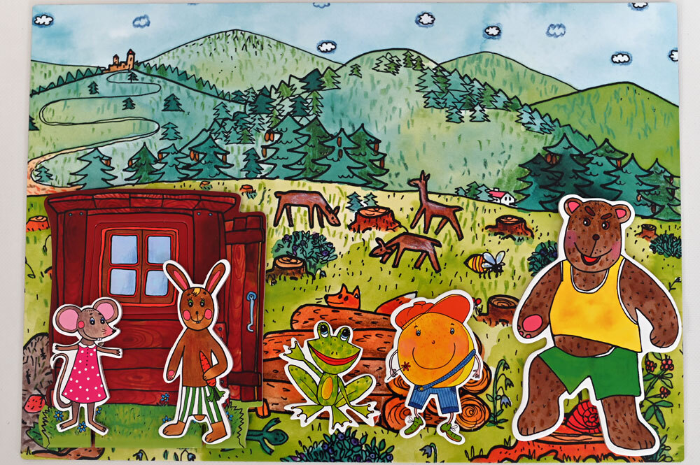 Loutky a kulisy k pohádce Boudo budko, kdo v tobě přebývá. Kvalitní výrobek z ekologického materiálu motivuje děti k vytváření vlastních příběhů. Díky veselému a vtipnému výtvarnému zpracování formuje i jejich estetické vnímání. Oboustranné loutky, kulisa Bouda, scéna se dvěma motivy. Pohádku můžete hrát samostatně anebo ji využít ve Vašem loutkovém divadle. Hraní si s loutkami rozvíjí rétoriku, komunikaci, improvizaci, představivost, fantazii, kreativitu a manuální zručnost.