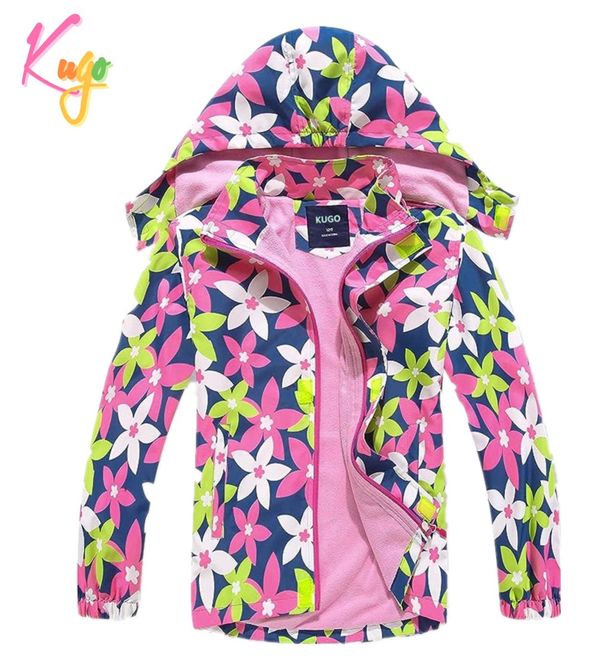 Velmi pěkná a kvalitní dívčí šusťáková bunda s květinami. Krásná holčičí bunda, která je vhodná pro podzimní a jarní chladné dny. Bunda pro holky s velkými barevnými květy zaujme a bude se líbit. Celá bunda včetně rukávů je podšita hřejivým fleecem. Bunda je nepromokavá a vhodná tedy i do nečasu. Má prodlouženou zádovou část, odepínací kapucu, nechybí ani kapsy a reflexní prvek na zadním dílu. Výborný je i stojáček u krku, který krk chrání před ofouknutím. Zapínání je na kvalitní klasický zip, doplněný ještě suchými zipy.