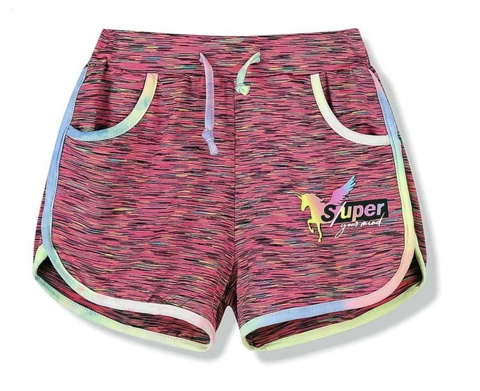 Krásné letní šortky, výborně vzdušné, v pase mají funkční šňůrku a dvě kapsy. Obruby jsou duhové a jako bonus motiv bájného Jednorožce. Která slečna by takové šortky nechtěla? Dívčí šortky s Jednorožcem jsou i krásně pružné, takže vhodné pro všechny denní aktivity.