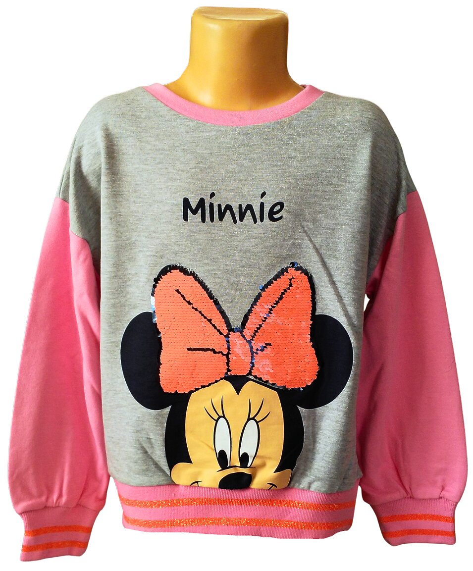 Krásná i praktická mikina s myškou Minnie a kouzelnou mašlí s měnícími se flitry. Barvu třpytivé mašle si holky určí samy, podle momentální nálady. Mikina je vhodná jako celoroční, je bez kapucky a tedy vhodná i pro vrstvení oblečení pod bundu. krásné a hlavně super pružné jsou i manžety, které zdobí třpytivá lurexová nitka. Na zadní straně je nápis Minnie se srdíčkem.