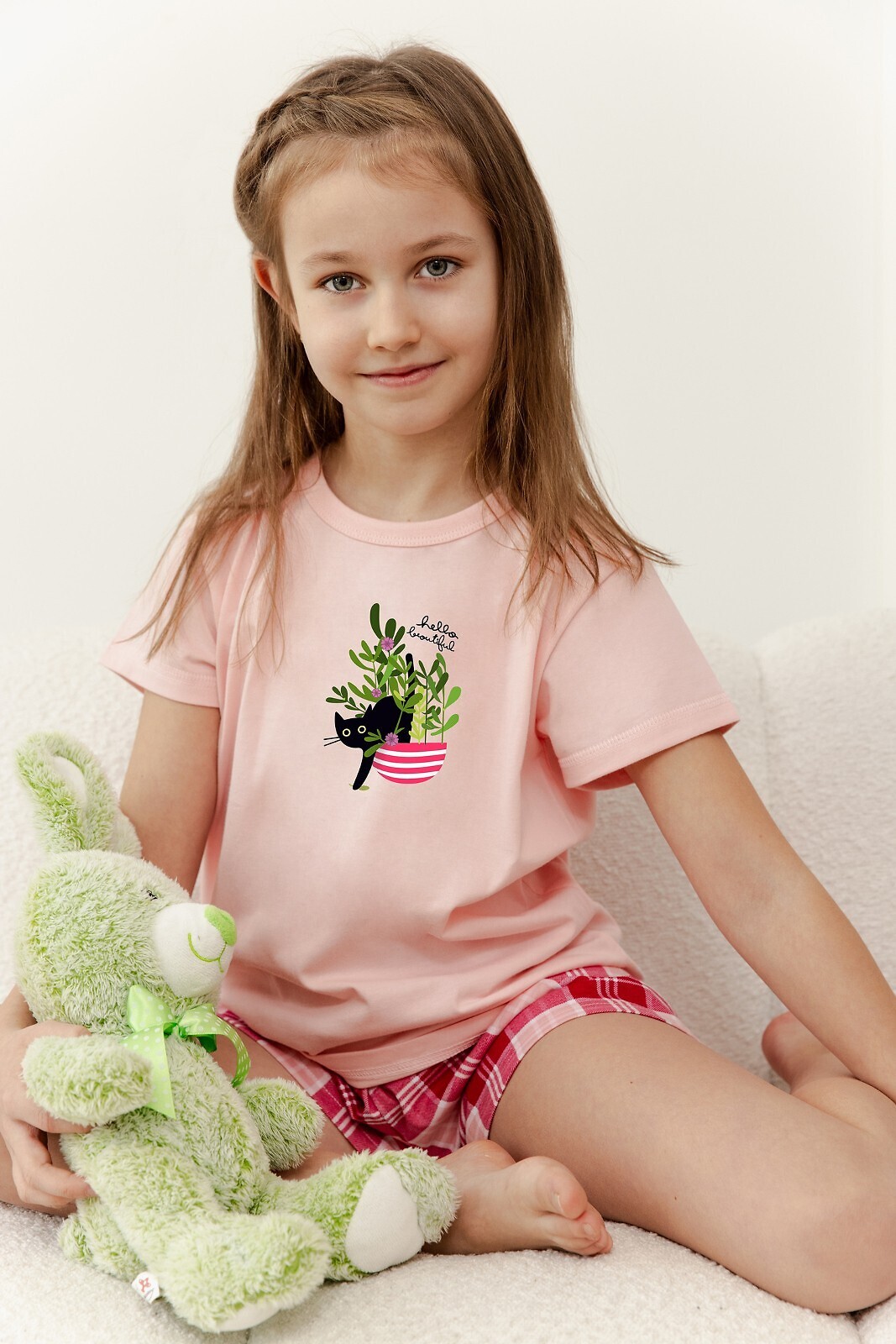 Letnia piżama dziewczęca- wysokiej jakości miękka bawełna- koszulka z krótkim rękawem- z przodu kolorowy nadruk- do kompletu krótkie wzorzyste spodenki- pakowana w foliowy woreczek číst celé