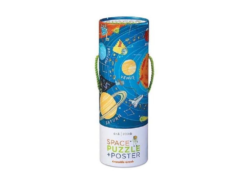 Puzzle s plakátem v kulaté krabici vhodné na přenášení s motivem vesmíru. 200 dílků, velikost složené puzzle 33x48 cm. Věk 6+