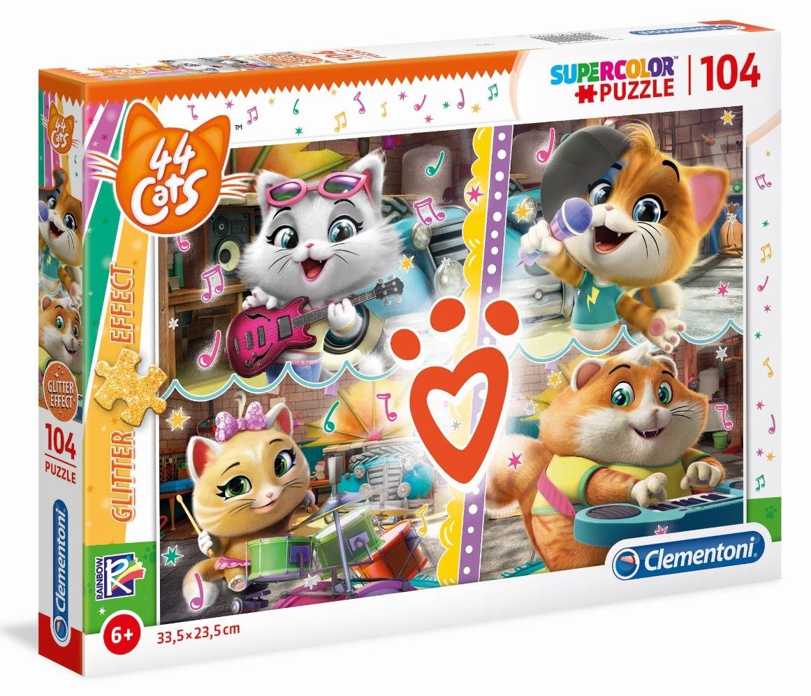 Puzzle wysokiej jakości marki Clementoni 104 brokatowe elementy, przedstawiające postaci z bajki 44 koty. číst celé