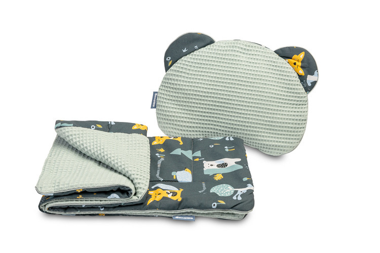Komplet do wózka Wafel składa się z poduszki (36x28 cm) i kocyka (56x76 cm). Dzięki takim rozmiarom komplet idealnie sprawdza się w wózku, łóżeczku czy jako miękka mata dla Maluszka. W środku znajduje się antyalergiczne wypełnienie, które zapewnia odpowiednią izolację przed chłodem. Sama poduszka może służyć jako Przytulanka. Zestaw został wykonany ze 100% bawełny - z jednej strony znajduje się nadruk, a z drugiej miękka bawełna o strukturze wafla, która nadaje niepowtarzalny wygląd całemu zestawowi