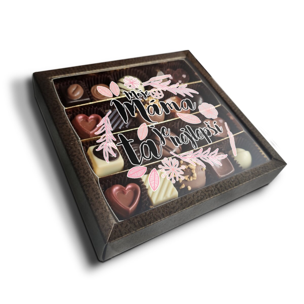 První dojem ale udělá dárková krabička s originálním motivem. Osobní věnování udělá vždy radost. Průhledné víko navíc nabídne krásný pohled na lahodné pralinky.