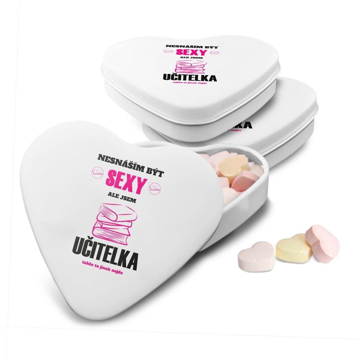 Bonbónky Nesnáším být sexy, ale jsem učitelka v dárkové srdíčkové krabičce jsou nejen sladkým potěšením, ale i milou vzpomínkou, kterou lze opakovaně využít. Skvěle se hodí jako malý dárek do kapsy nebo dárek navíc k většímu překvapení.