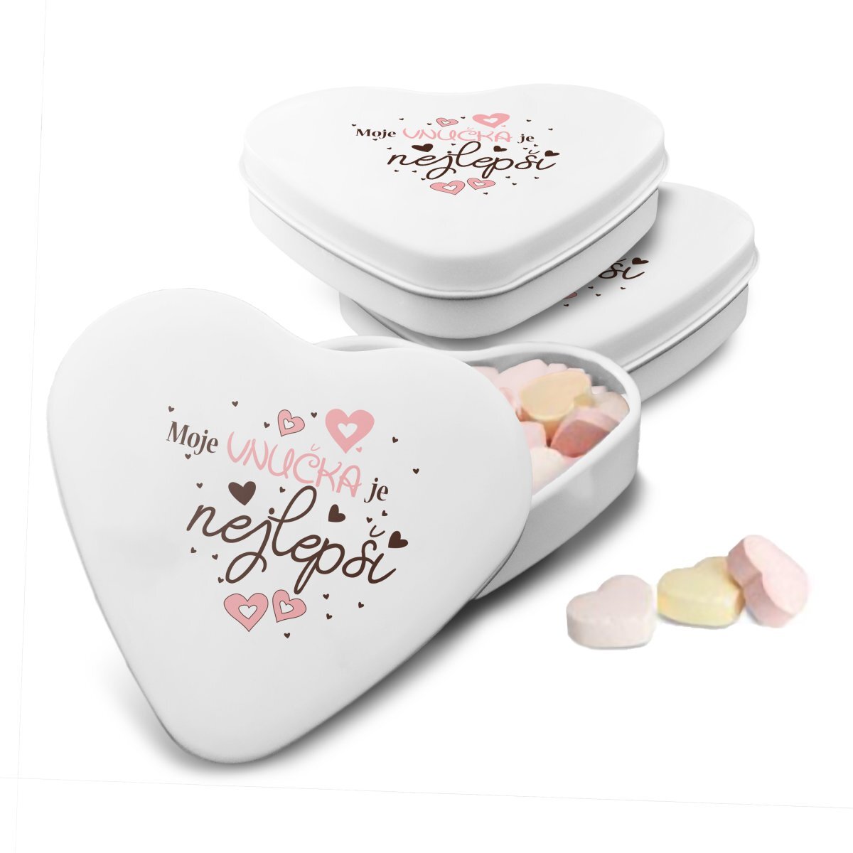 Bonbónky v srdíčkové krabičce s originálním motivemBonbónky jsou malým dárečkem pro potěšení a je vhodné darovat je jako doplněk s jiným dárkem z našeho e-shopu nebo v dárkové krabičce s ostatními produkty.Udělejte radost malým dárkem do kapsy, sladkými bonbóny v kovové krabičce ve tvaru srdce. Každého mlsouna potěší "Lipo" bonbónky v krabičce, kterou může dále používat a poslouží mu jako milá vzpomínka. V krabičce jsou namixované různé příchutě bonbónků ve tvaru srdce. Originální potisk dodá bonbónkům nádech výjimečnosti.Rozměr: 70 x 65 x 15 mmHmotnost: 40g