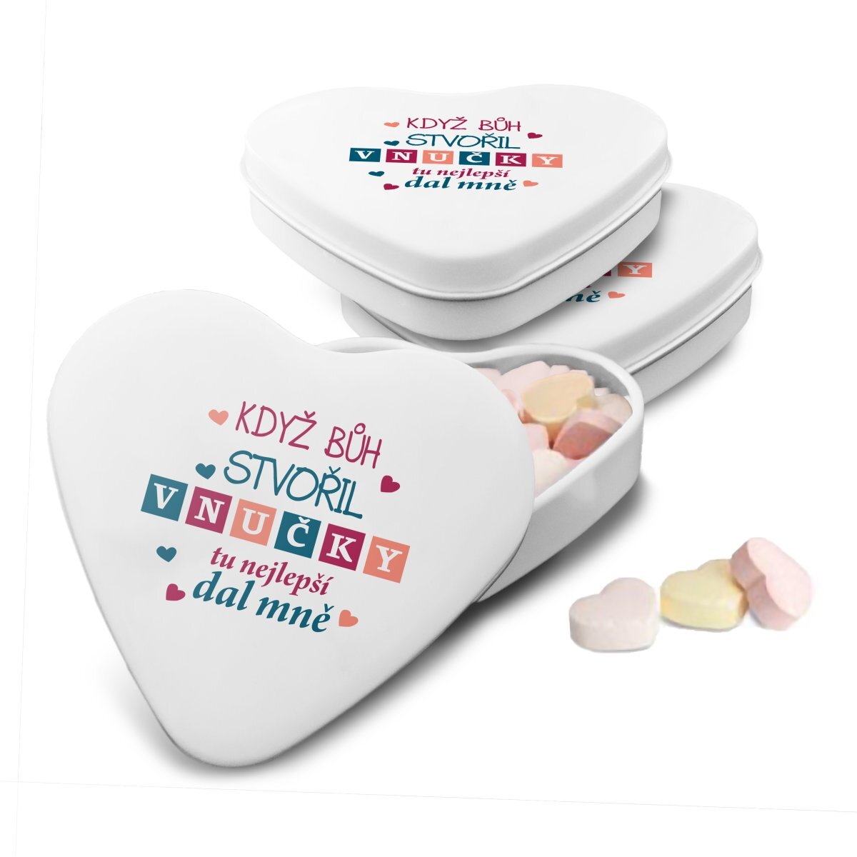 Bonbónky v srdíčkové krabičce s originálním motivemBonbónky jsou malým dárečkem pro potěšení a je vhodné darovat je jako doplněk s jiným dárkem z našeho e-shopu nebo v dárkové krabičce s ostatními produkty.Udělejte radost malým dárkem do kapsy, sladkými bonbóny v kovové krabičce ve tvaru srdce. Každého mlsouna potěší "Lipo" bonbónky v krabičce, kterou může dále používat a poslouží mu jako milá vzpomínka. V krabičce jsou namixované různé příchutě bonbónků ve tvaru srdce. Originální potisk dodá bonbónkům nádech výjimečnosti.Rozměr: 70 x 65 x 15 mmHmotnost: 40g
