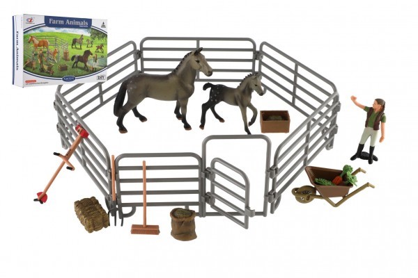 Krásná sada nejen pro malé farmáře a milovníky koní, ale také fajn doplněk do každého pokojíčku. Snadno zvířátkám postavíte výběh a díky doplňkům v sadě (zvířátka, farmíř, kolečko, seno, vidle atd) se dokáže o své mazlíčky skvěle postarat. Sada obsahuje 22 dílků. Rozměr balení: 27 x 18 x 7 cm Vhodné pro děti od 3 let