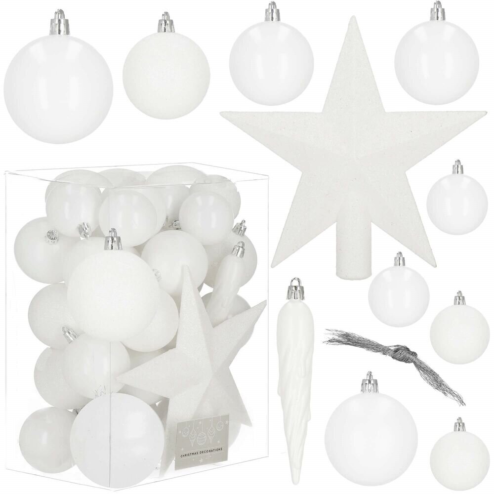 Luxusní 33 dílná sada vánočních ozdob na stromeček. Set tvoří 3 různé vzory ozdob bílé barvy + překrásná hvězda na špičku stromku. Vše z nerozbitného plastového materiálu. Ideální k výzdobě stromečku nebo jako vánoční dekorace. Zdarma provázky pro snadné zavěšení.
