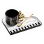 Podšálek ve tvaru klavíru je nejen elegantní základnou pro šálek, ale i originálním designovým kouskem s motivem klávesnice a černými akcenty. Zlatá lžička dodává celému setu luxusní nádech a dokonale doplňuje jeho sofistikovaný vzhled.