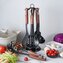 - Obsah sady: obracečka s otvory, síto/skimmer, lžíce na špagety, naběračka na polévku, metla, kuchyňské kleště, černý stojan