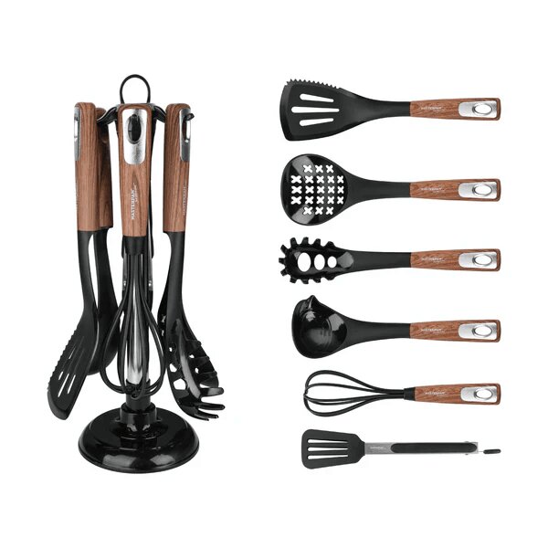 Sada obsahuje všechny základní nástroje, které každý kuchař potřebuje - obracečku, síto, lžíci na špagety, naběračku, metlu, kuchyňské kleště a praktický stojan. Vše je elegantně zabaleno v barevné krabici, která z této sady dělá i perfektní dárek pro vaše blízké, kteří si rádi užívají vaření.