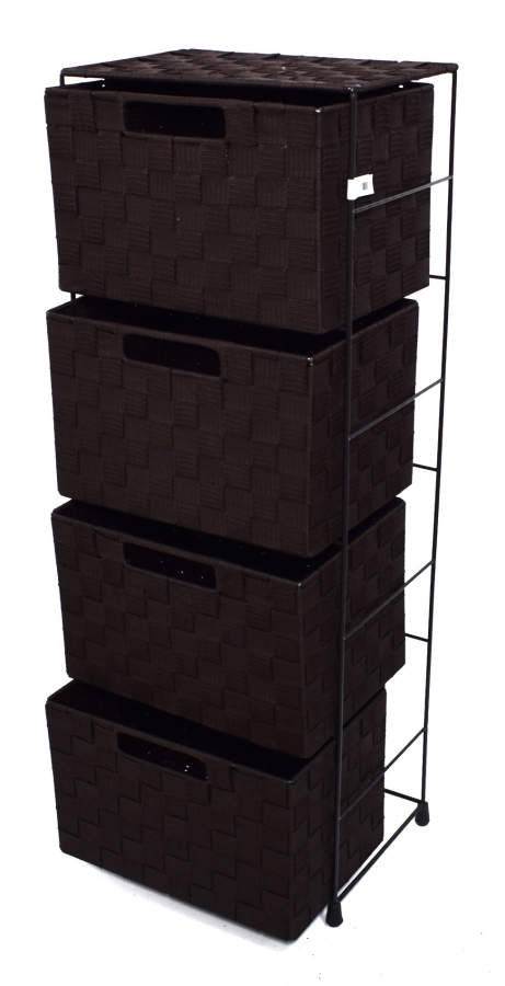 Nylonová komoda se 4 výsuvnými zásuvky bude nejen potřebná na uschování spousty drobností jak v ložnici, pracovně, obýváku nebo třeba v dětském pokoji. Komoda má ocelovou stabilní konstrukci ve které jsou umístěné ocelové zásuvky potažené nylonovým výpletem. Každá zásuvka má praktické madlo pro snadné vysunutí. Rozměr komody - výška 81 cm, šířka 30 cm a hloubka 22cm, rozměr zásuvek - šířka 29 cm, výška 19 cm a hloubka 20 cm