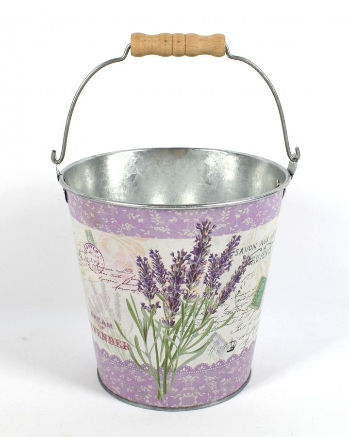Vědro Levandule Provance můžete použít jako obal na květináč nebo jako dekoraci na cokoliv. Vědro je vyrobeno z pocínovaného plechu o Ø 15 cm nahoře a 11 cm dole, 14,5 cm je vysoké bez držadla.