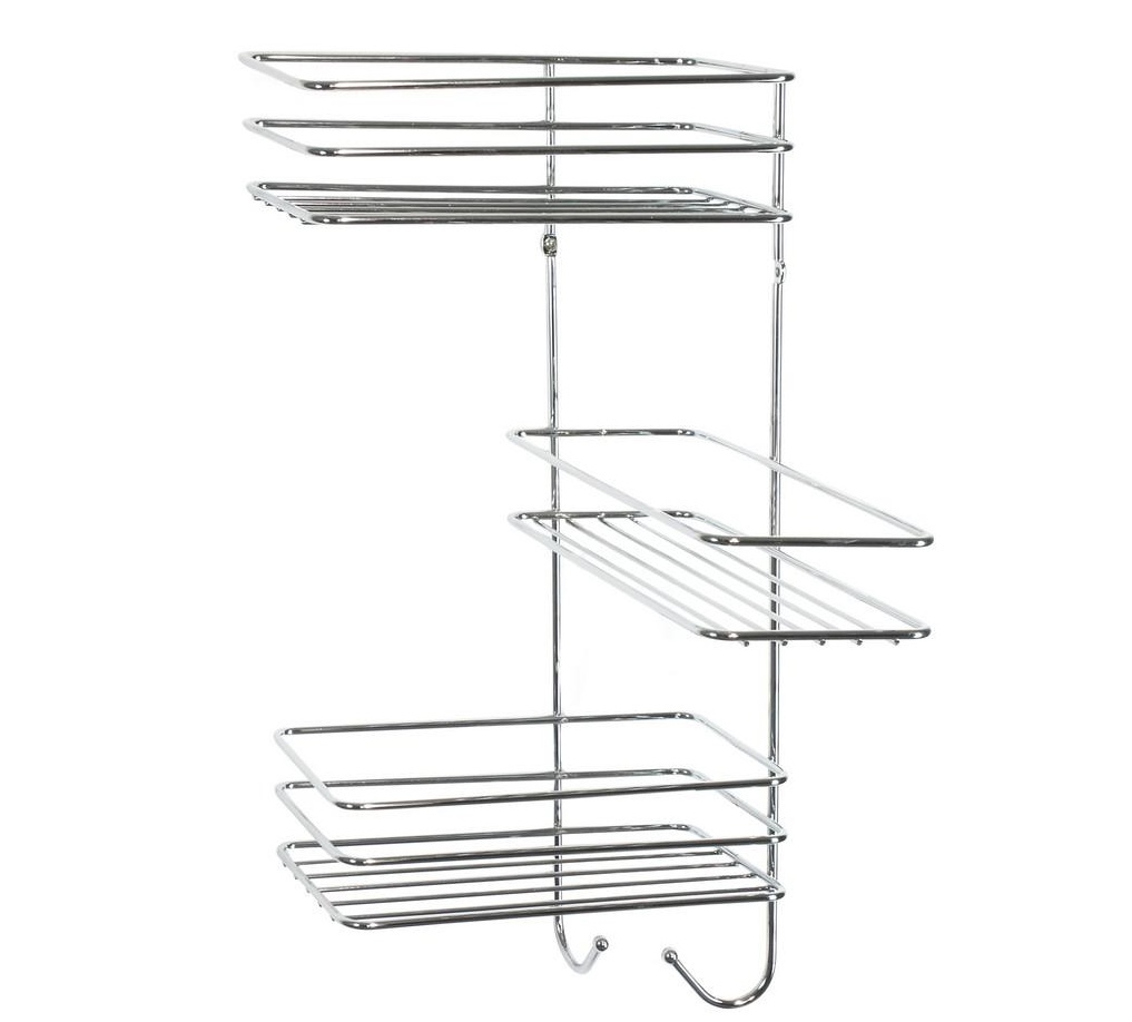 Kvalitní rohová třípatrová koupelnová polička vyrobená z chromovaného drátu. Polička je vybavena háčky na zavěšní houbičky, žínky apod. Rozměry 27 x 26.5 x 48.5 cm. Montážní materiál součást balení, montáž pomocí vrtání. EAN 5904993720042
