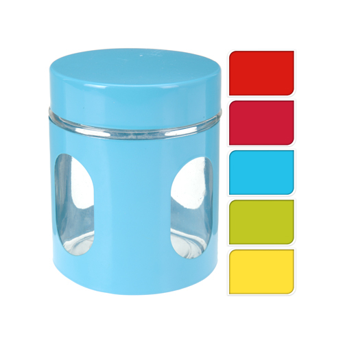 Dóza sklenená, chránená plechovým obalom, ideálna pre uchovávanie potravín. Obal dózy v 5 farebných prevedeniach. Rozmer 10X12cm.