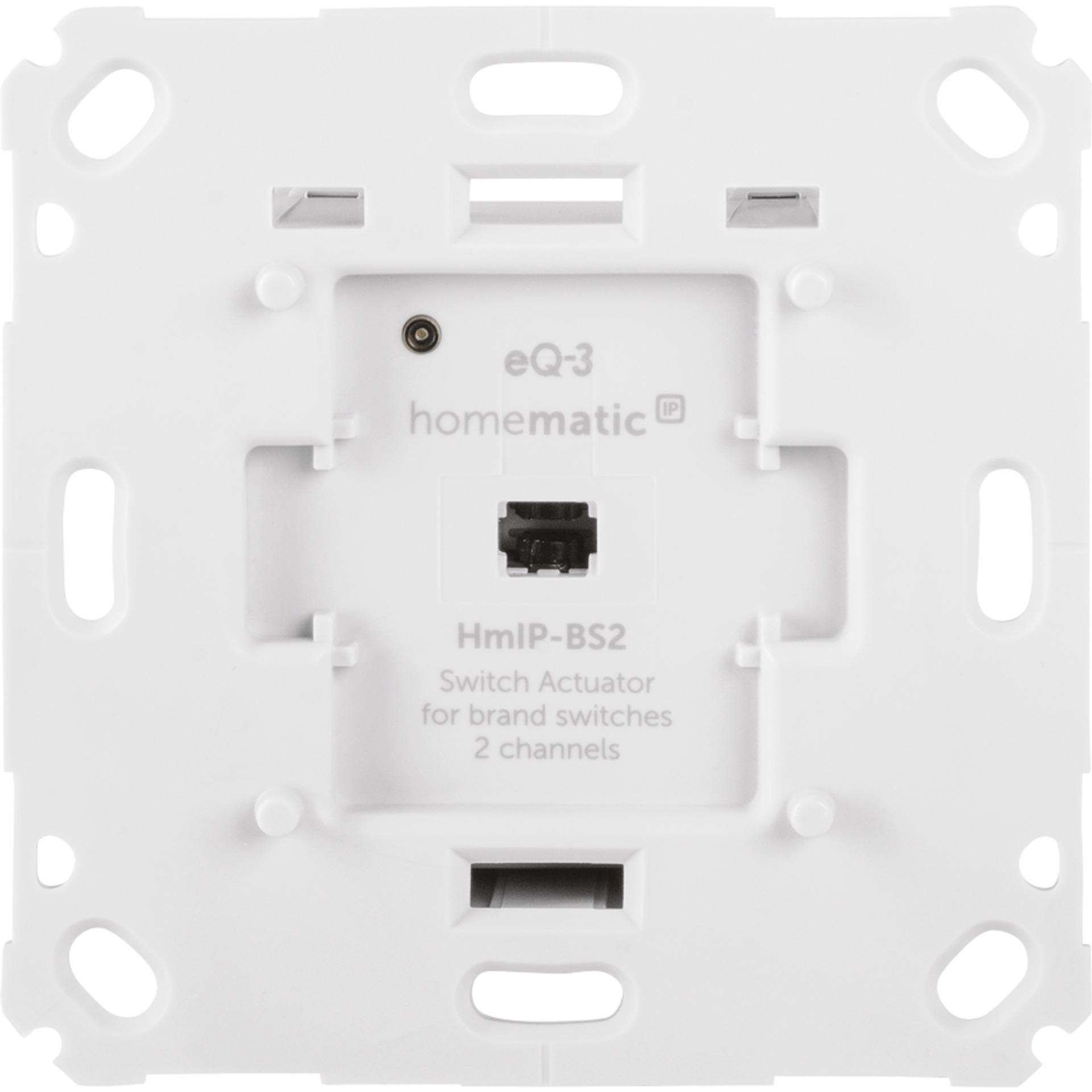 Programovatelný bezdrátový Spínací akční člen dvoukanálový (HmIP-BS2) pro zápustnou montáž, napájený ze sítě 230 V, je součástí systému chytré domácnosti Homematic IP.