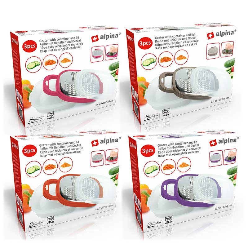 Víceúčelové struhadlo se třemi typy nožů a zásobníkem na odpad v růžové barvě. Přídavné víko chrání rošt při skladování. Hmotnost: 0,4 kg.