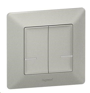 Valena Life with Netatmo dvojitý bezdrátový spínač osvětlení (baterie CR2032 a oboustranná lepenka součást balení) pro ovládání až 20 drátových přístrojů (spínačů/stmívačů, zásuvek, mobilních zásuvkových adaptérů, kabelových výstupů a mikromodulů pro osvětlení). Zadní strana je zcela plochá (lze montovat na zeď, sklo, nábytek pomocí šroubů nebo oboustranné lepenky) - barva Hliník, dodáván s rámečkem v barvě Hliník