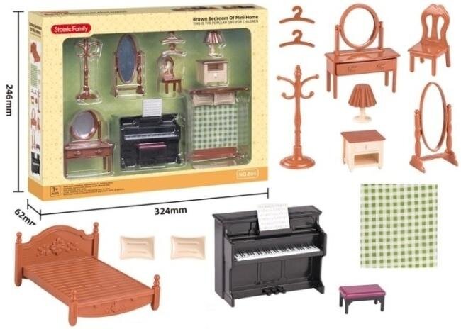 Souprava nabízí vše, co potřebujete pro vytvoření teplé a útulné ložnice: pohodlnou postel s hnědým rámem a dvěma měkkými polštářky, elegantní toaletku s oválným zrcadlem a šuplíkem na drobnosti, stylové piano s přiloženou notovou partií, funkční noční stolek s poličkou, noční lampičku s jemným stínidlem, věšák na oblečení, stojací oválné zrcadlo, fialovou pufu ideální k pianu, károvaný koberec a drobné dekorace jako kartáček a flakonky. Každý detail je pečlivě propracován tak, aby napomáhal kreativnímu rozvoji dětí, podporoval manuální zručnost a povzbuzoval je k hraní rolí.
