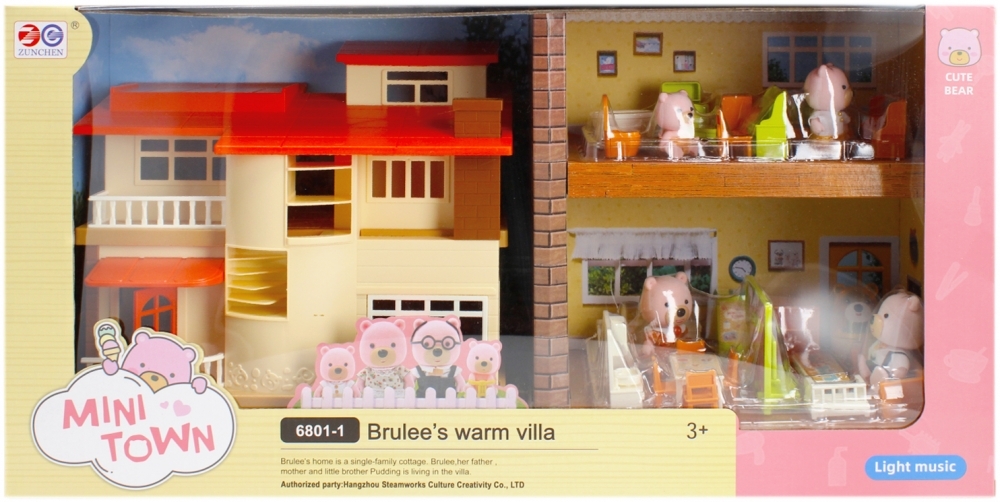 Zalety produktu: duży, dwupoziomowy domek, posiad ruchome elementy, posiada efekty dźwiękowe oraz świetlne, flokowane Misie posiadają ruchomą głowę, ręce oraz nogi. Składany domek dla Misiów z serii Mini Town od MEGA CREATIVE to podstawowy element zabawy dla każdej młodej damy. Bez wątpienia, Twoją pociechę czeka wiele wspaniałych chwil podczas urządzania wnętrza czy zabawy w dom Misiów Zawartość zestawu: domek, mebelki, 4 figurki misiów. Zestaw wykonany z plastiku. Wymiary/waga/baterie: wymiary produktu dł. x wys. x gł. cm : 27x22x16, wymiary opakowania dł. x wys. x gł. cm : 55x28x19, waga produktu bez opakowania kg : 0,45 kg, waga produktu w opakowaniu kg : 1,31 kg, wymaga zasilania bateriami 3 x AG13- załączono do zestawu. Zestaw przeznaczony dla dzieci w wieku: 3 . Pakowany w kartonik z okienkiem. W kartonie zbiorczym po 10 szt.