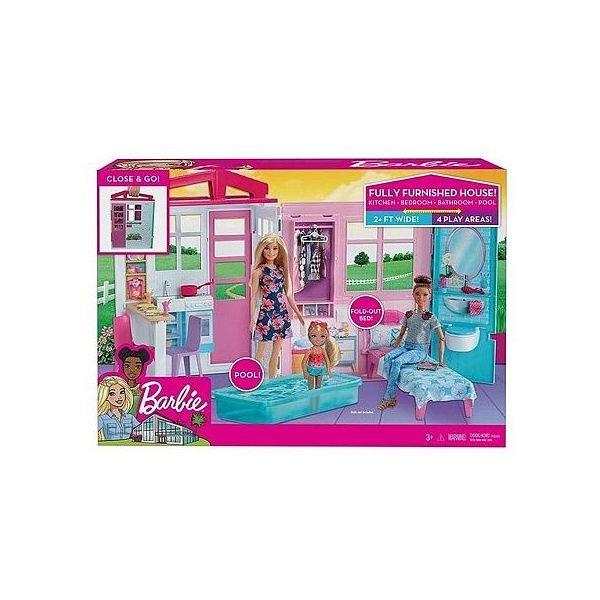 Útulný dům Barbie® je jako stvořený pro víkendový odpočinek. Jakmile do něj vstoupíš, ocitneš se v malé kuchyňce se zabudovaným dřezem a troubou. Když je jídlo hotové, prostři k nedělnímu obědu vyklápěcí pultík, ke kterému se vejdou dvě židličky. V ložnici najdeš pohodlnou vyklápěcí postel se vzorovanou přikrývkou a hned vedle malou koupelnu s toaletou, která má dokonce i sklápěcí prkénko. V horkých dnech je bazén tou nejlepší volbou. Napusť do něj vodu a zábava může začít! Vzhled celého domku dotváří venkovní osvětlení v podobě lucerniček. Domeček se snadno rozkládá a zase skládá a díky madlu jej můžeš vzít všude s sebou. Panenky Barbie nejsou součástí balení. Věk 3+ Rozměry balení: 46,5 x 46,5 x 14 cm