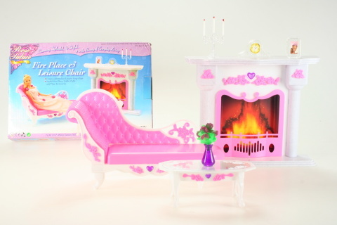 Glorie Sada s krbem a lenoškou obsahuje plastový krb o rozměrech cca 29 cm x 6 cm x 20 cm,na kterém je postaven plastový svícen cca 8 cm,obrázek cca 4 cm a plastové hodiny cca 7 cm, dále plastovou lenošku o rozměrech cca 27,5 x 8 cm cm,stoleček o výšce cca 9 cm s postvavenou květinou o výšce cca 6 cm. Panenka není součástí balení.Věk 3+