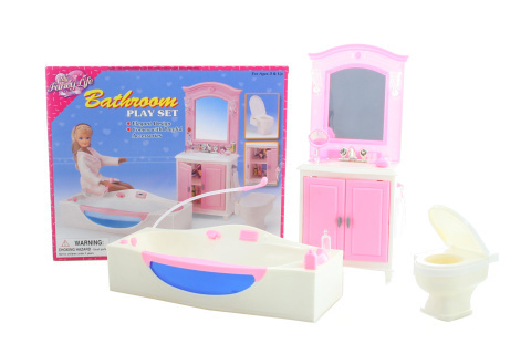 Glorie Koupelna obsahuje toaletku s umyvadlem 12 x 27 cm , vanu 26 x 12 cm a toaletu 10 x 7 cm. Součástí jsou také doplňky /kosmetika, mýdlo, ručník atd.). Vyrobeno z plastu. Panenka není součástí balení. Rozměry balení cca 30 x 25 x 7 cm. Věk 3+