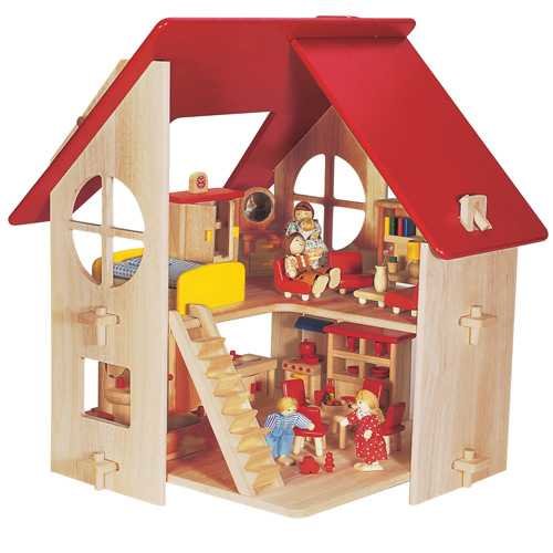 Domeček pro panenky značky Blue Ribbon.Dřevěný domeček pro panenky je vyroben z velmi kvalitního, tvrdého, velmi dobře zpracovaného, kaučukového dřeva. Na barevné díly je použita kvalitní, ekologická, trvalá barva.Velký jednopatrový domeček pro panenky se jednoduše, ale pevně sestavuje díky chytrým spojům bez nutnosti použití lepidla. Je navrhut tak, aby umožnil snadný přístup do všech koutů domečku.Součásti dřevěné hračky je precizní nábytkové vybavení s pohyblivými částmi jako jsou výsuvné šuplíky, dvířka skříněk nebo otvírání pračky a záchodu. Domeček pro panenky obsahuje: manželskou postel, skříňku se zrcadlem, sprchový kout, vanu, umyvadlo se zrcadlem, pračku, záchod, sporák s troubou a odsávačem, dvojitý dřez, stůl, 4 židle, sedačku, 2 křesla, 3 různé skříně a samozřejmě schody do patra.Domeček pro panenky obsahuje i 5 postaviček rodinky, včetně miminka. Jde o dřevěné 12 cm (dospělí), 10 cm (děti) vysoké postavičky s pohyblivými končetinami, oděných do látkového oblečení.Dřevěná hračka splňuje všechny normy EU. Všechny tyto dřevěné hračky nadchnou každou holčičku pro hru na domácnost a rozvíjí smysl pro rodinné hodnoty.