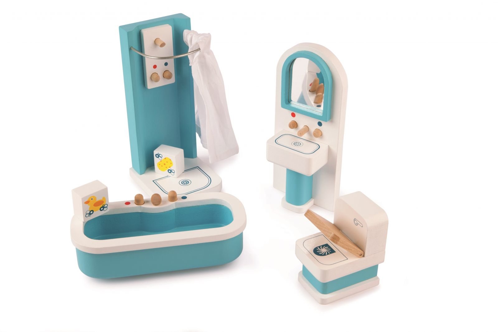 Krásný nábytek z bukového dřeva se bude hodit do každého domečku pro panenky, má prostě vše, co budou děti potřebovat k vytvoření koupelny pro panenky, které se potřebují o sebe postarat po celém dni plném her. Set o šesti kusech zahrnuje sprchový kout s textilním závěsem, vanu, umyvadlo se zrcadlem, toaletu a 2 koupelnové doplňky v podobě gumové kachničky a mycí houby. Po perném dni plném hry venku na zahradě mohou děti své panenky pořádně umýt. Krásně detailní set se bude hodit do domečku pro panenky Tidlington (T0220) a jiné domečky standardní velikosti. Podporuje kreativní a představivou hru. Vyrobeno z kvalitních materiálů z odpovědných zdrojů. Odpovídá evropské bezbečnostní normě. Skládá se z 6 dílů. Hračky anglické značky TIDLO Timeless Toys jsou, jak název napovídá, nadčasové dřevěné hračky vyráběné společností John Crane již od roku 1984. Všechny hračky, jež vychází z moderních trendů, nabízejí vynikající hodnotu, kvalitu, design a bezpečnost pro děti.