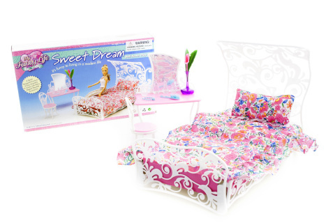 Glorie ložnice obsahuje postel s vysokým čelem (19 x 32 x 23 cm), toaletní stolek (15 x 8 x 19 cm) a židličku 6 x 13 cm. Součástí je také povlečení a doplňky. Panenka není součástí balení. Rozměry balení cca 33,5 x 20,5 x 6 cm. Věk 3+.