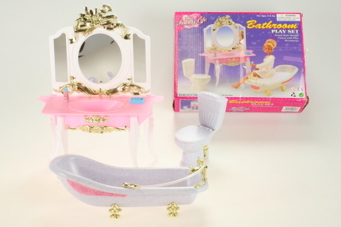 Glorie Koupelna obsahuje toaletku s umyvadlem o rozměrech cca 23 cm X 10 cm X 30 cm,vanu o rozměrech cca 10 cm X 25 cm X 8,5 cm a s WC toaletou cca 6 cm X 10,5 cm X 12 cm s.Vyrobeno z plastu.Panenka není součástí balení.Věk 3+