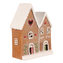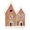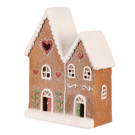 Přidejte do vaší vánoční výzdoby nový prvek v podobě perníkového dvojdomku z magnéziové keramiky. Nabízí skutečně věrohodné napodobení perníku, který okouzlí každého svou detailností a pohádkovým vzhledem. Zasněžená bílá střecha a bílá okénka a lem dveří dodávají domku zimní ráz. Barevné zdobení červenými srdíčky a zelenými lístky na hnědém základě, přidává do prostoru hravost a pestrobarevnost. Vnitřní dutá část je vybavena LED osvětlením, které je napájeno třemi bateriemi typu AAA. Svou velikostí bude tento dvojdomek výrazným dekoračním prvkem ve vašem interiéru a každá návštěva vám bude závidět tuto úžasnou vánoční ozdobu.