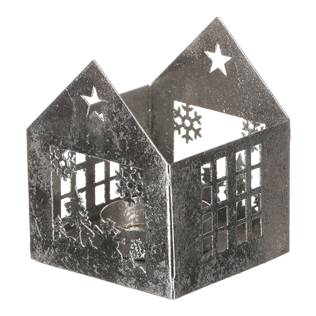 Kovový svícen ve tvaru domečku ve stříbrném dekoru, dodá interiéru nádech elegance a možnost vyvolat kouzelný světelný efekt. Tento svícen nejenže přináší světlo a zářivou atmosféru, ale také představuje půvabný dekorační prvek pro váš domov. Umístěte do něj svíčku a sledujte, jak se zářivé světlo line prostorem. Ideální volba pro vánoční výzdobu, která okouzlí každého, kdo váš domov navštíví.