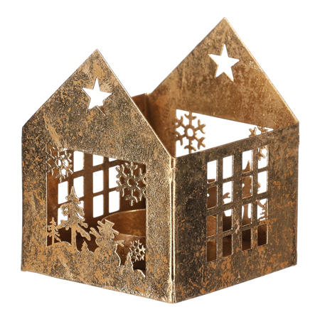 Kovový svícen ve tvaru domečku ve zlatém dekoru, dodá interiéru nádech elegance a možnost kouzelného světelného efektu. Tento svícen nejenže přináší světlo a zářivou atmosféru, ale také představuje půvabný dekorační prvek pro váš domov. Umístěte do něj svíčku a sledujte, jak se zářivé světlo line prostorem. Ideální volba pro vánoční výzdobu, která okouzlí každého, kdo váš domov navštíví.