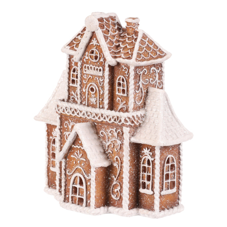 Polyresinová stolní dekorace, v podobě zdobeného patrového domku v perníkovém designu, bude nádhernou dekorací pro kouzelné vánoční období. Vypadá jako by byl skutečně vytvořen z perníku a ozdoben sladkou bílou polevou. To ale ještě není vše! Díky zabudovanému LED osvětlení uvnitř, si můžete po jeho rozsvícení vychutnávat pohled na nádherně rozptýlené paprsky, které vycházejí skrze všechna okénka ven.