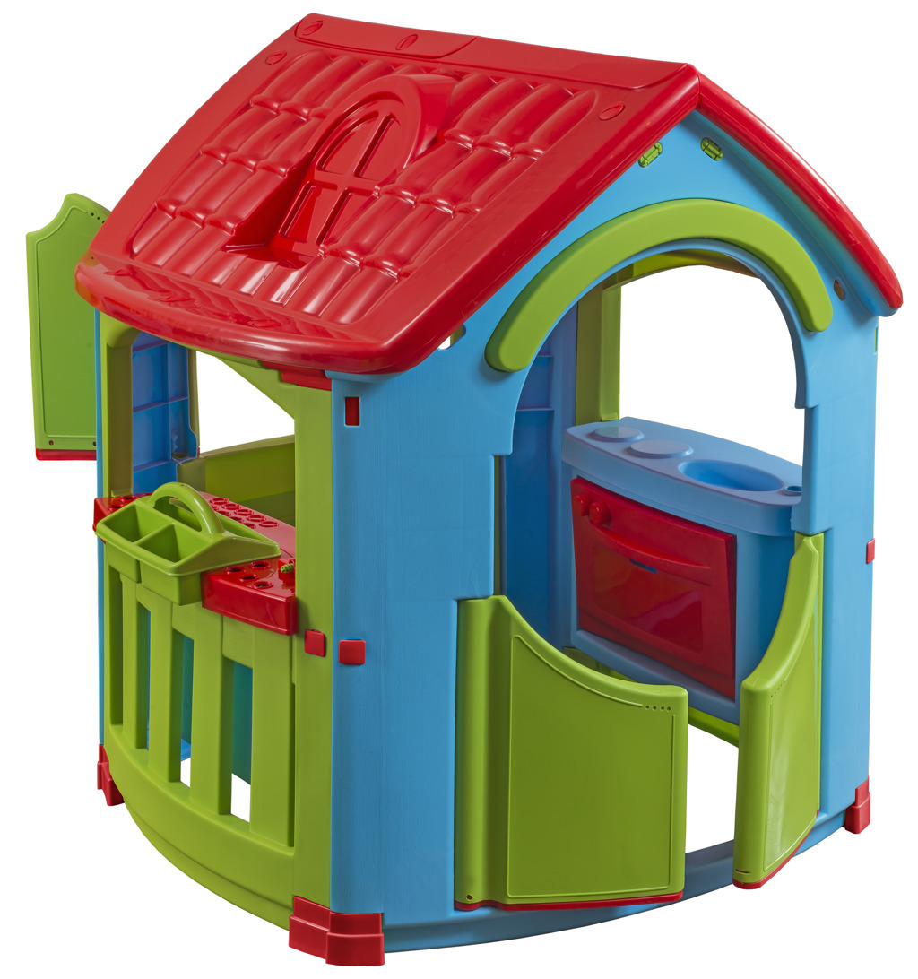 Plastový domeček s příslušenstvím pro kluky (dílna) i holky (kuchyňka), rozměry 101×108×113 cm. číst celé