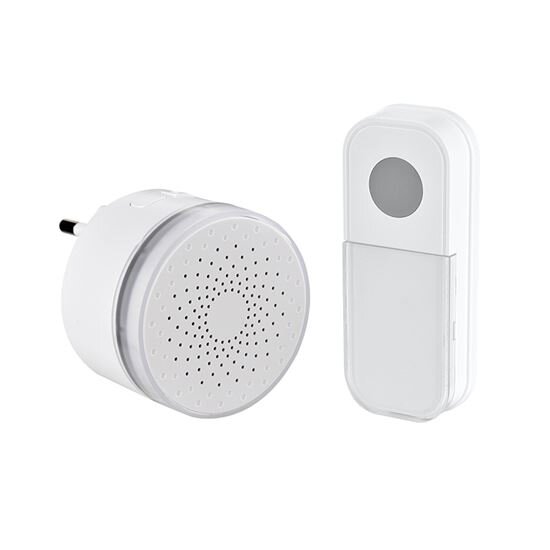 Solight bezdrátový mini zvonek Technické parametry: funkce „Learning code“ umožňuje spárování více zvonků nebo tlačítek do jedné skupiny: k jednomu zvonku může být spárováno max. 8 tlačítek jedno tlačítko může být spárováno s max. 15 zvonky, na každém zvonku může být nastavena jiná melodie 5cm veliký zvonek nezabírá místo v okolí jakékoli elektrické zásuvky osvětlený kruhový rámeček LED signalizace zvonění 36 volitelných melodií LED indikátor zvonění na zvonku i tlačítku tlačítko s krytem na jmenovku, vodotěsná ochrana IP44 nastavení hlasitosti zvonku - 4 stupně: 0 - 90dB (90 - 65 - 40 - 0dB pouze blikání) uchycení tlačítka pomocí samolepící podložky nebo montážních otvorů barva: bílá dosah signálu na otevřeném prostranství: 180m přenosová frekvence: 433.92MHz napájení: tlačítko: 1 x 3V (CR2032) baterie (součástí balení) zvonek: AC 230V - do zásuvky spotřeba energie: přijímač (zvonek) v klidovém režimu: