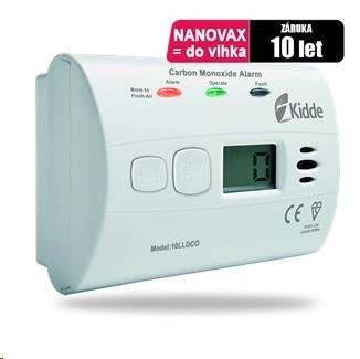 Detektor CO, měřící zařízení Kidde 10LLDCO, odolný proti vlhkosti s de-ionizovaným vodním elektrolytem, který provádí testování každou vteřinu na smrtelné nebezpečí v podobě oxidu uhelnatého. Novou funkcí tohoto nejnovějšího detektoru CO s produkce výrobce Kidde je LED indikátor, který v případě poruchy nebo nízké kapacity bateriového zdroje žlutě bliká a tak doplňuje odpovídající grafickou informaci zobrazenou na LCD panelu doprovázenou varovným akustický signálem a speciální zámek, jehož cílem je zabránění odstranění zařízení instalovaného na stěnu dětmi nebo nepovolanými osobami.