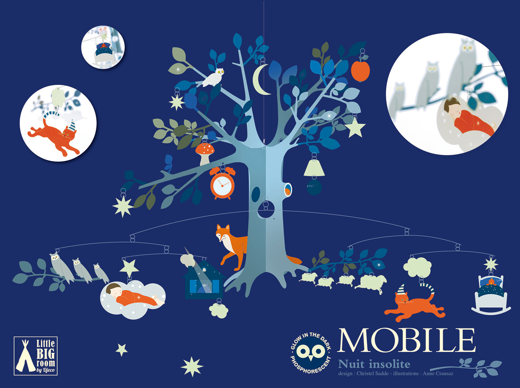 Krásná závěsná dekorace na strop nebo nad postýlku s motivem lesního dobrodružství od francouzských designerů.