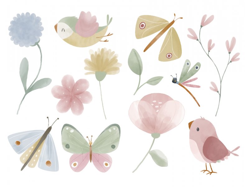 Samolepky jsou součástí designové kolekce Little Dutch Květiny a motýli, ve které najdete ložní prádlo, dekorativní doplňky do dětského pokoje, dřevěné a plyšové hračky i jídelní doplňky pro dětské stolování.
