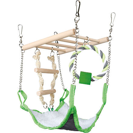 Vyrobený z kvalitního dřeva a bavlny, nabízí nejen přírodní vzhled, ale také bezpečné a příjemné prostředí díky houpací síti s bavlněným či beránčím vzhledem z polyesteru. Díky lanovému žebříku a kruhovému lanu s dřevěnou kostkou se vaši hlodavci zabaví při lezení a hře, což stimuluje jejich přirozené instinkty a zabraňuje nudě.
