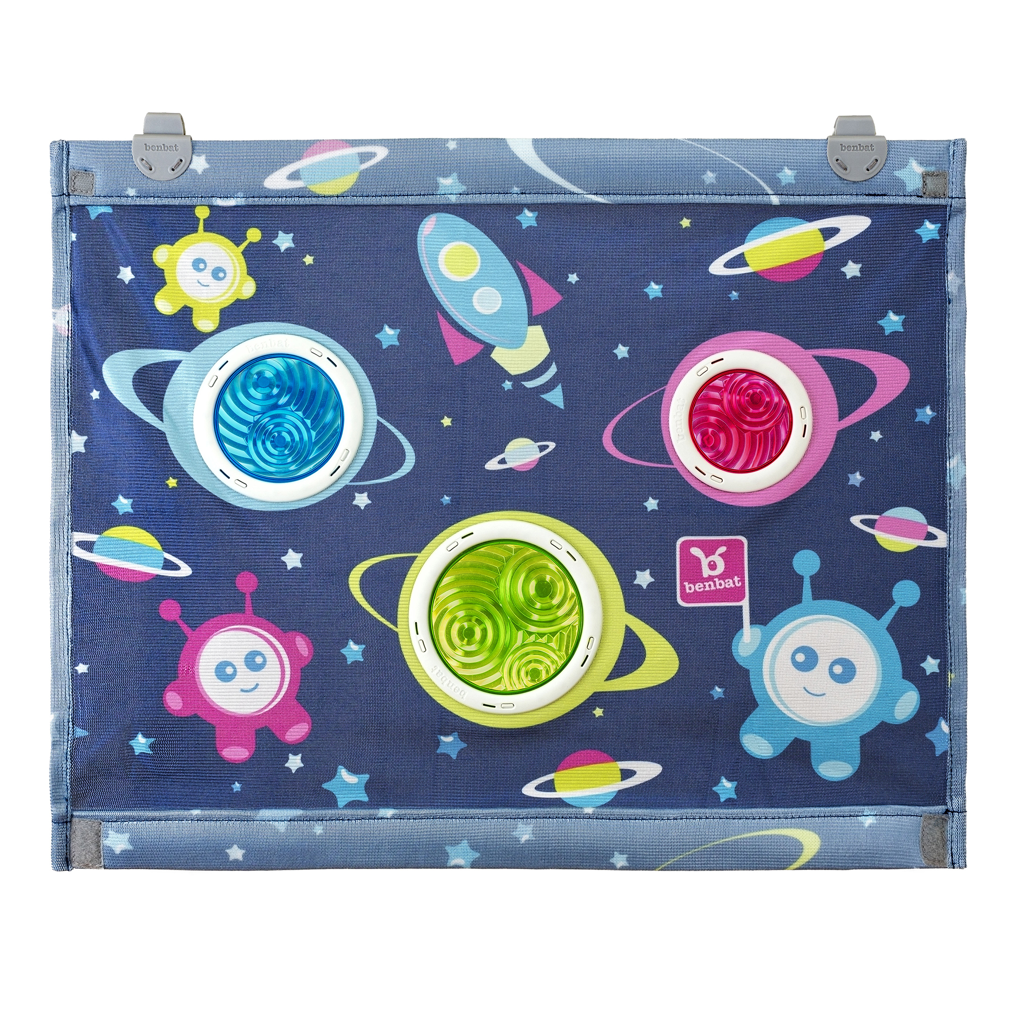 Sluneční clona Dazzle Car byla speciálně navržena tak, aby vytvořila zajímavé a podnětné prostředí pro děti na cestách. Malí cestující si budou v autě připadat jako v kosmické lodi. Přirozené denní světlo vytváří na cloně znázorňující vesmír fascinující textury, které vizuálně stimulují smysly dítěte. Síťový materiál chrání dítě před sluncem, zároveň ale odfiltruje paprsky, aniž by omezil výhled z okénka. Clona je extra široká, upevňuje se za pomocí háčků. Pomocí suchého zipu ji lze složit na polovinu.