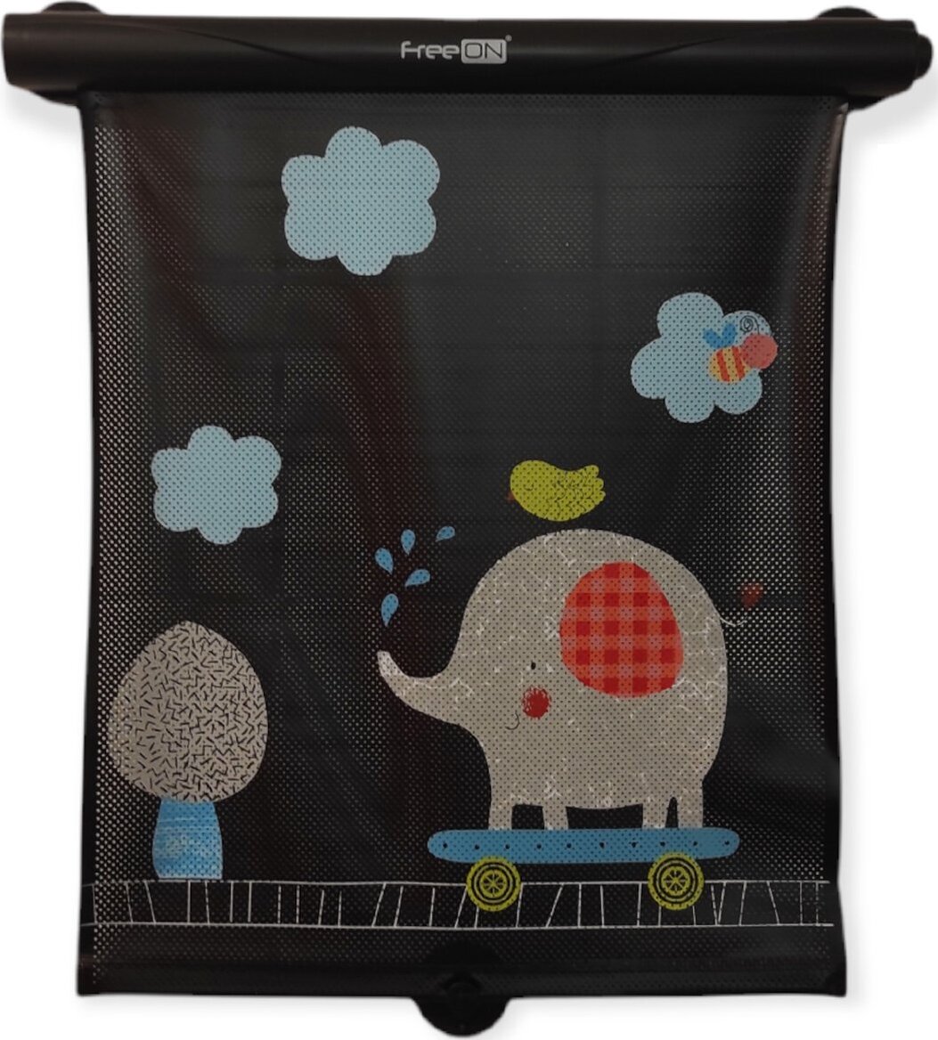 Stínítko do auta s motivem Sloníka. Stínítko s tlačidlem pro automatické srolování a se dvěma přísavkami pro instalaci na okno.