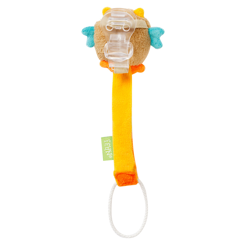 - Pestrobarevná hračka na dudlík se zabudovaným chrastítkem láká ke hraní.