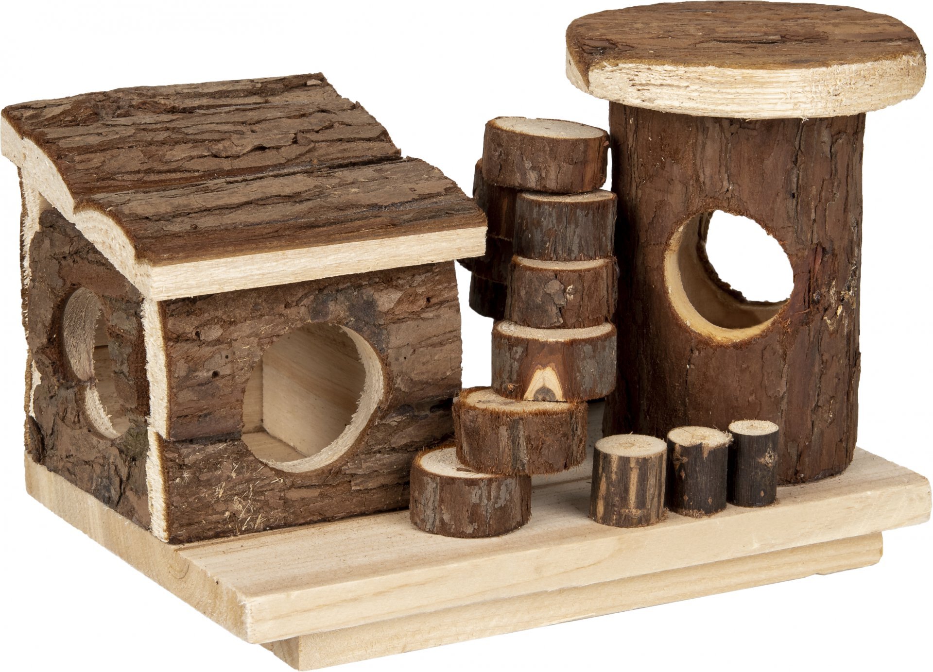 Dřevěná prolézačka pro hlodavce ve tvaru domečku, vyrobená z přírodních materiálů, podpoří mentální stimulaci, aktivitu a přirozené chování jako je kousání, lezení nebo skrývání. Rozměr: 21x15x13 cm